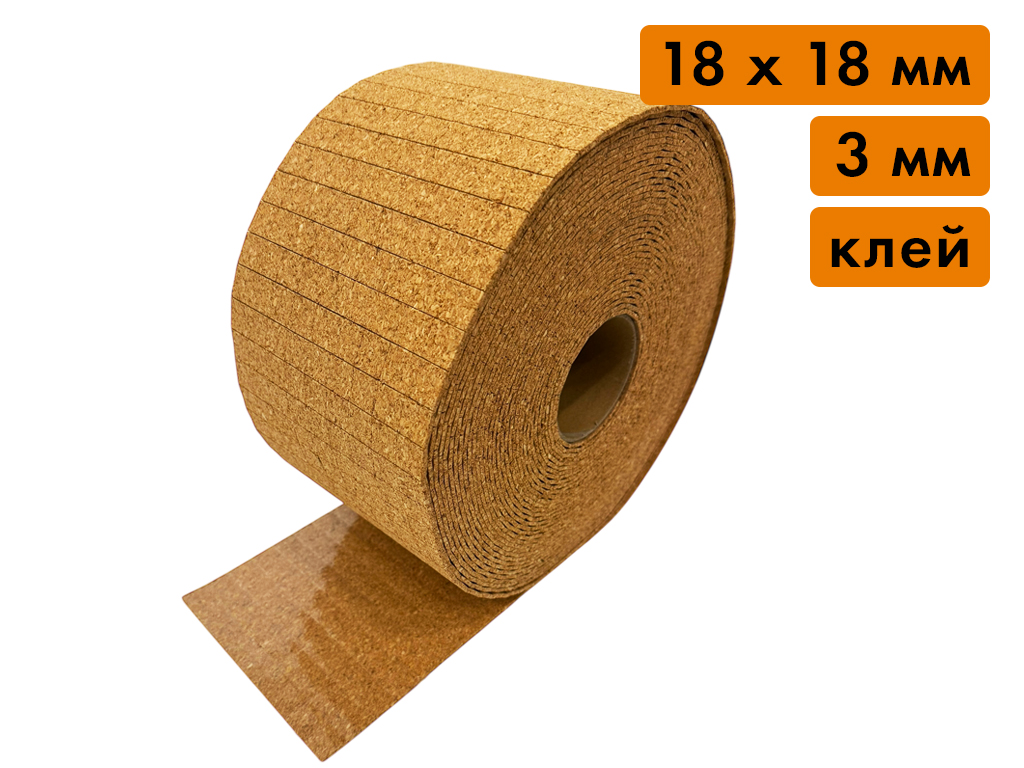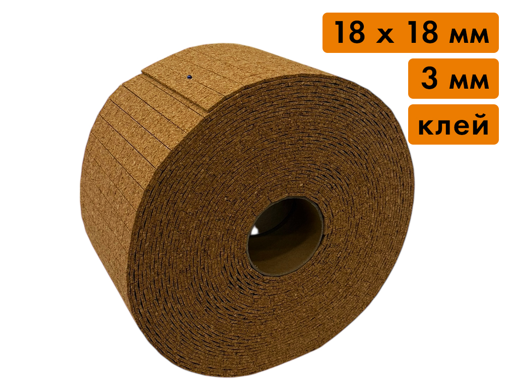 Пробковая прокладка в рулоне, размер 18х18 мм, толщина 3 мм (клеящий слой, 10'000 шт)